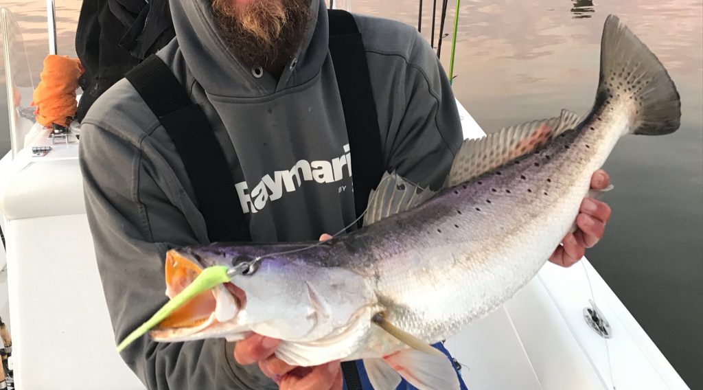 Captain L.W. sums up his theory- “If I’m fishing soft plastic shrimp lures, I put a scent on ‘em.”