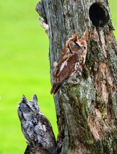 The Eastern screech owl’s small size makes it susceptible to injury by automobiles. Many a campfire ghost story has been enhanced by the haunting wail